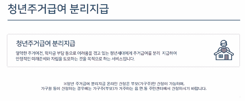 우선 신청인은 청년이 아닌 부모가 자신이 거주하는 시군구에 분리지급을 신청하여야 합니다. 계속 말하지만 온라인으로 가능하고요. 원래는 주민등록 주소지 관할 읍.면.동 주민센터에서 가능합니다.