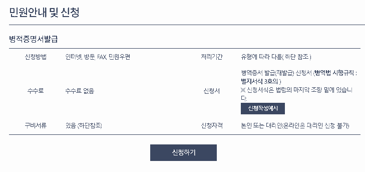 카테고리 중 두 번째 페이지에 있는 병적증명서를 클릭하세요. 둘 다 같습니다. 그 후 신청하기를 누르세요.