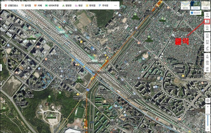 아무것도 건드리지 않은 상태의 네이버 지도는 일반 도면 지도로 설정되어 있습니다. 위성 지도로 보려면 오른쪽 상단에 있는 위성 지도를 클릭하세요.