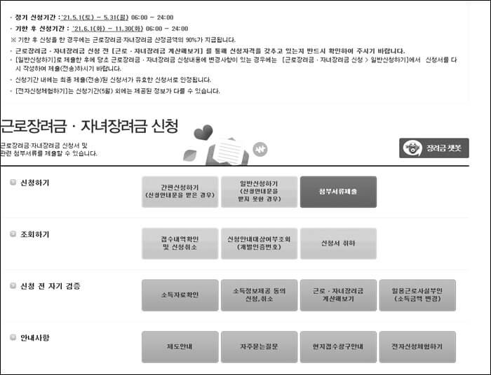 접수내역도 조회할 수 있고, 신청서를 취하할 수도 있습니다. 또 근로장려금 계산, 자료 확인 등의 작업도 할 수 있습니다.