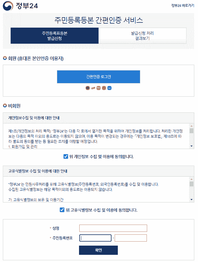 만약 회원이 아니라면 비회원 로그인도 가능하니 참고바랍니다. 현재는 간편인증으로 발급이 가능하니 이 점도 참고하시면 좋겠습니다.