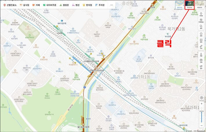 아무것도 건드리지 않은 상태의 네이버 지도는 일반 도면 지도로 설정되어 있습니다. 위성 지도로 보려면 오른쪽 상단에 있는 위성 지도를 클릭하세요.